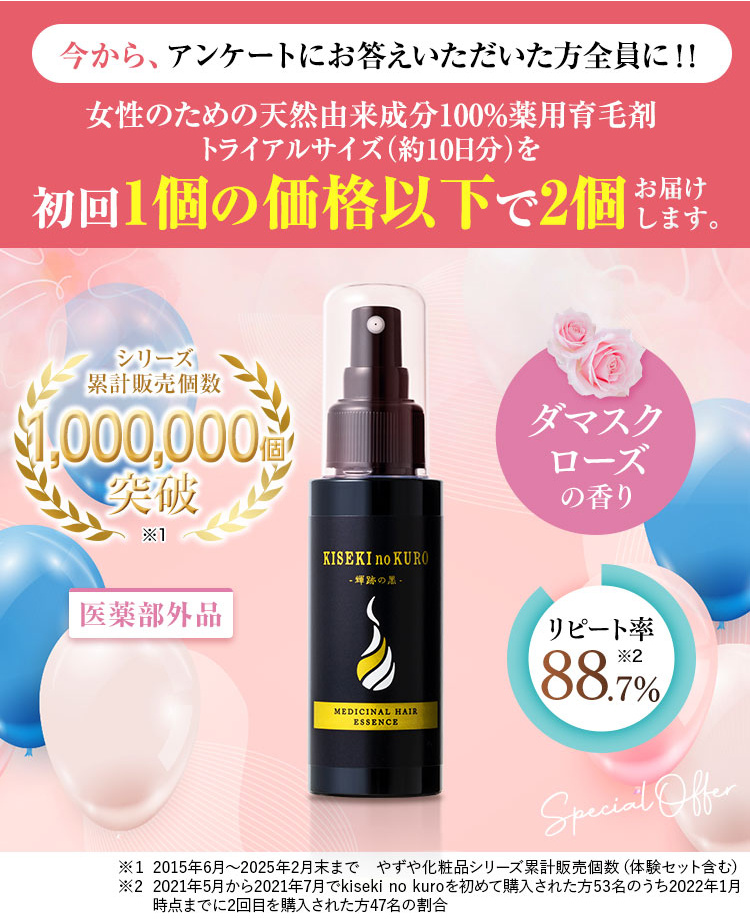 ※1 2015年6月~2025年2月末やずや化粧品シリーズ累計販売個数(体験セット含む) ※2 2021年5月から2021年7月でkiseki no kuroを初めて購入された方53名のうち2022年1月時点までに2回目を購入された方47名の割合