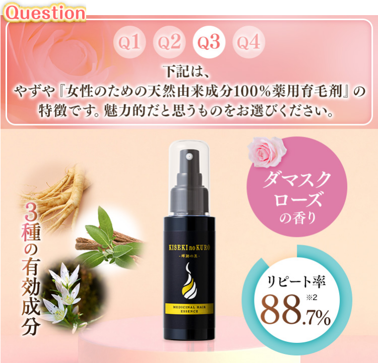 やずや『女性のための天然由来成分100%薬用育毛剤』は、ダマスクローズ&ゼラニウムの香りでリフレッシュできる。