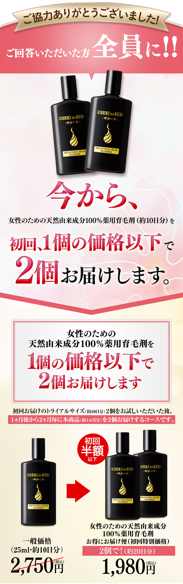 やずや 『女性のための天然由来成分 100%薬用育毛剤』は 1日分でわずか155円※