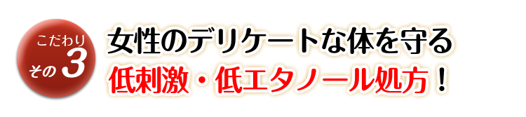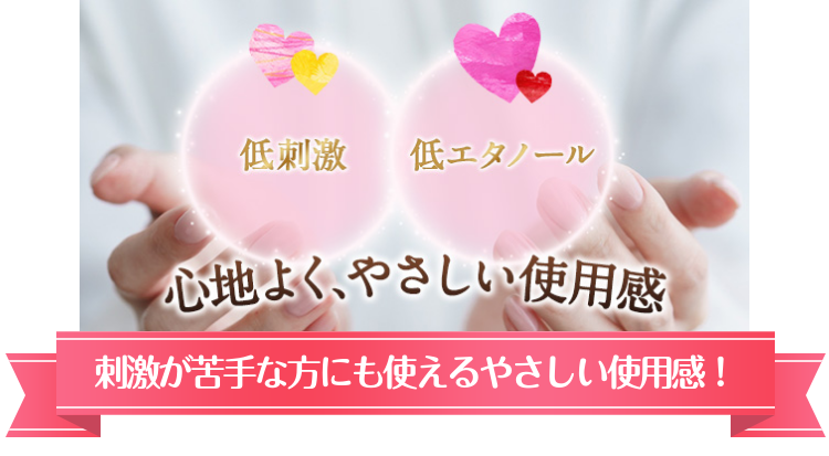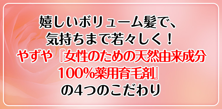 一般的な育毛剤のスーッとする使用感や、香りが苦手という方もいらっしゃます。そこで、やずや『女性のための天然由来成分100%薬用育毛剤』は、女性の体に徹底的に配慮して低刺激・低エタノール処方で、心地よくやさしい使用感を実現しました。
