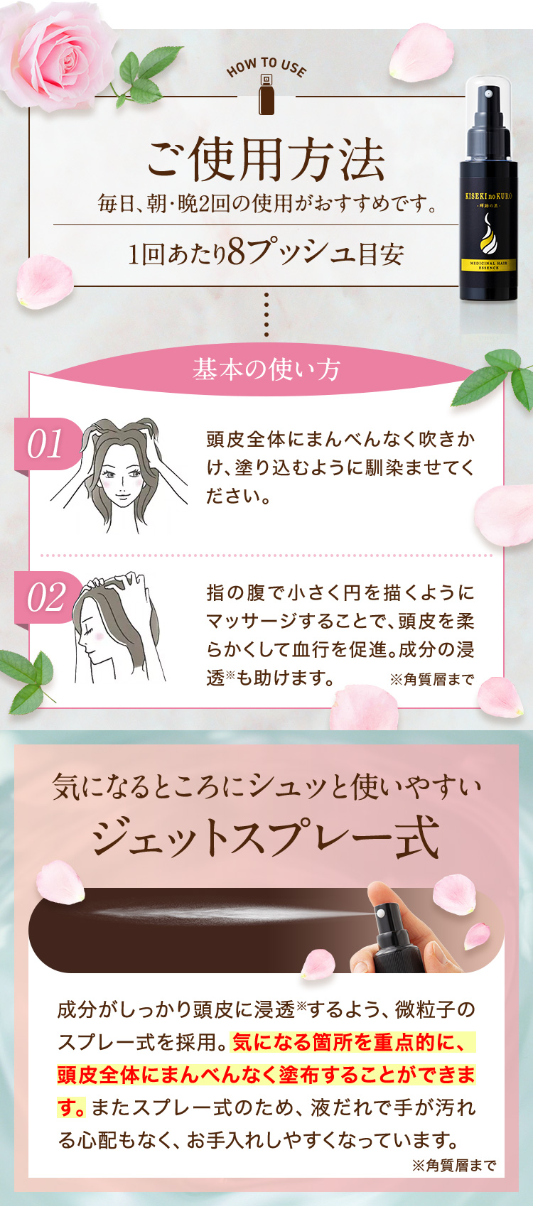 また、年齢とともに乾燥しがちな 頭皮をしっかりとうるおすことで 頭皮環境をサポート。
