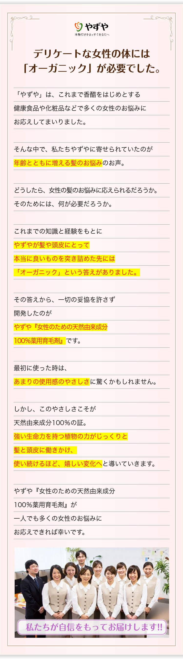 やずや『女性のための天然由来成分100%薬用育毛剤』は、デリケートな女性の体を考えて石油系成分は一切不使用。