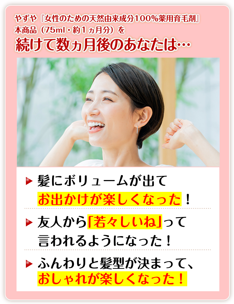 若々しいふんわり髪を 手に入れるためには 忙しい生活の中でも継続して、 やずや 『女性のための天然由来成分 100%薬用育毛剤』を 使用することが重要です。
